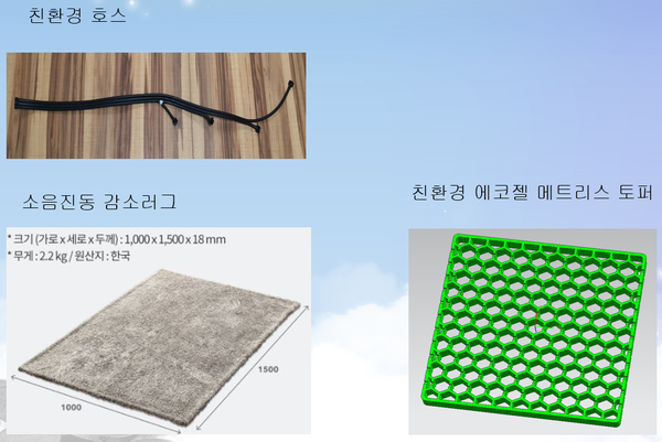 친환경 에코젤 메트리스 토퍼와 결로방지 박스, 안마의자 세라믹 볼, 친환경 도마 그리고 소음저감 러그 제품을 개발한 이후 세라젬과 코웨이 등에 제품을 공급하고 있다. 지난 해 충남 공주에 공장을 설립한 회사는 올해 탄소열선 제조 특허출원을 했다.